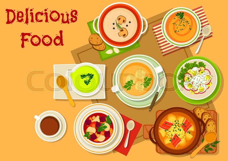 Popular Soup Menu Icon With Mushroom Cream Soup Egg Vegetable Salad